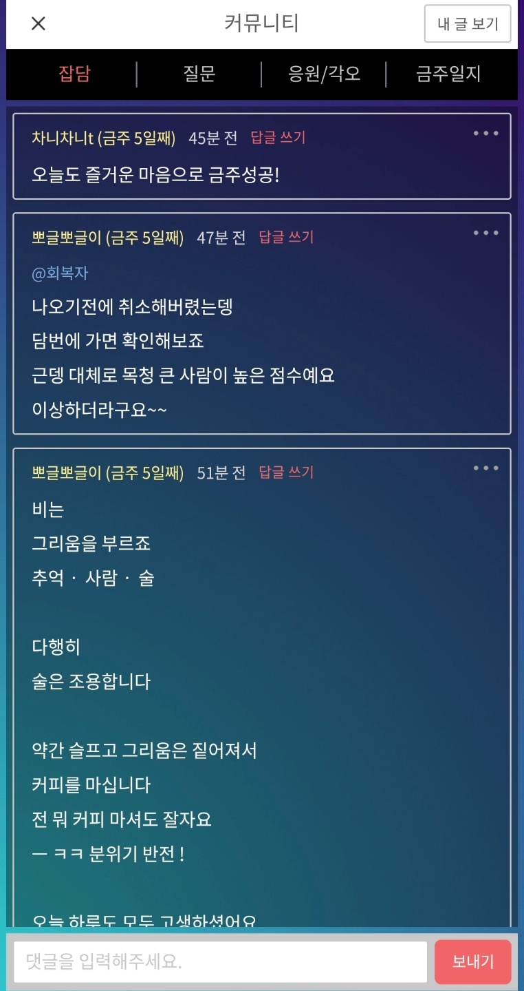 서로 응원하고 좋은 말도 하고 걱정도 하고 자기 말도 하고 다양한 사람들이 있다.