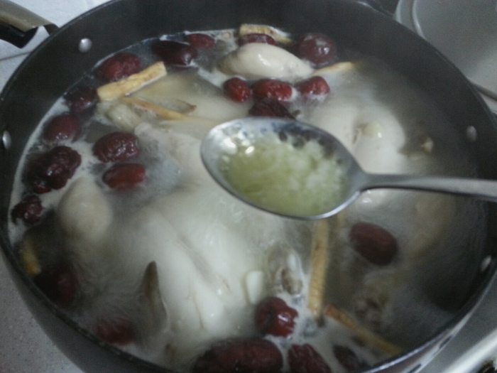 지금처럼 통마늘 대추 각종 한약재 등과 닭을 넣고 끓이면 된다. 강불 20분 중불 30분 약물 30분 정도면 된다.