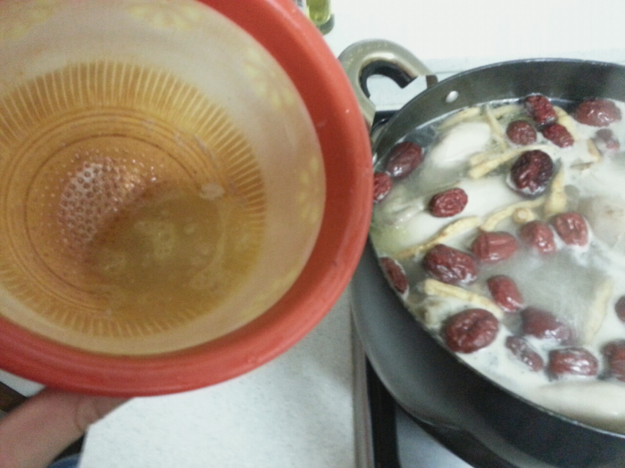 물을 끓이기 시작하면 거품과 기름이 둥둥 뜨기 시작한다. 그것을 제거해주는 것이 남은 일이다.