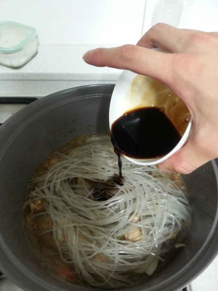 바로 물에 불려둔 당면을 투하해서 위에서 익혀줍니다. 당면을 잘 올린 후에 더 끓이다가