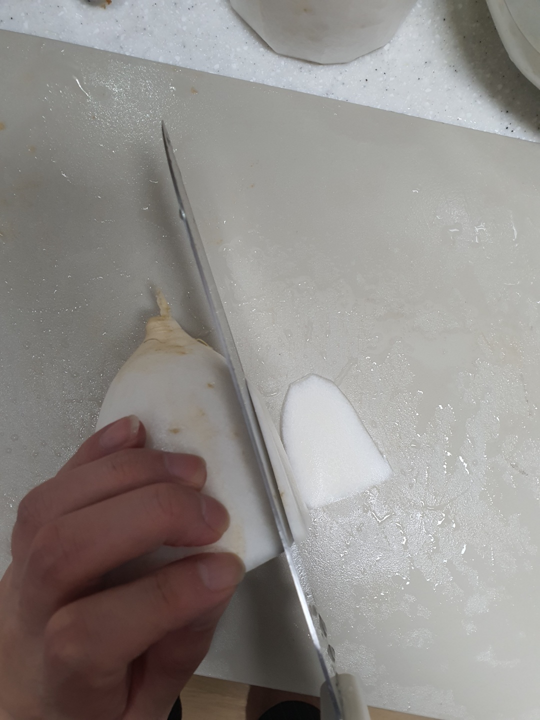 1. 일단 첫째로 그냥 무를 쓰면 안된다, 싱크대에서 무를 빡빡 씻자 겉부분에 흙이 있기 때문에 씻어야한다.
