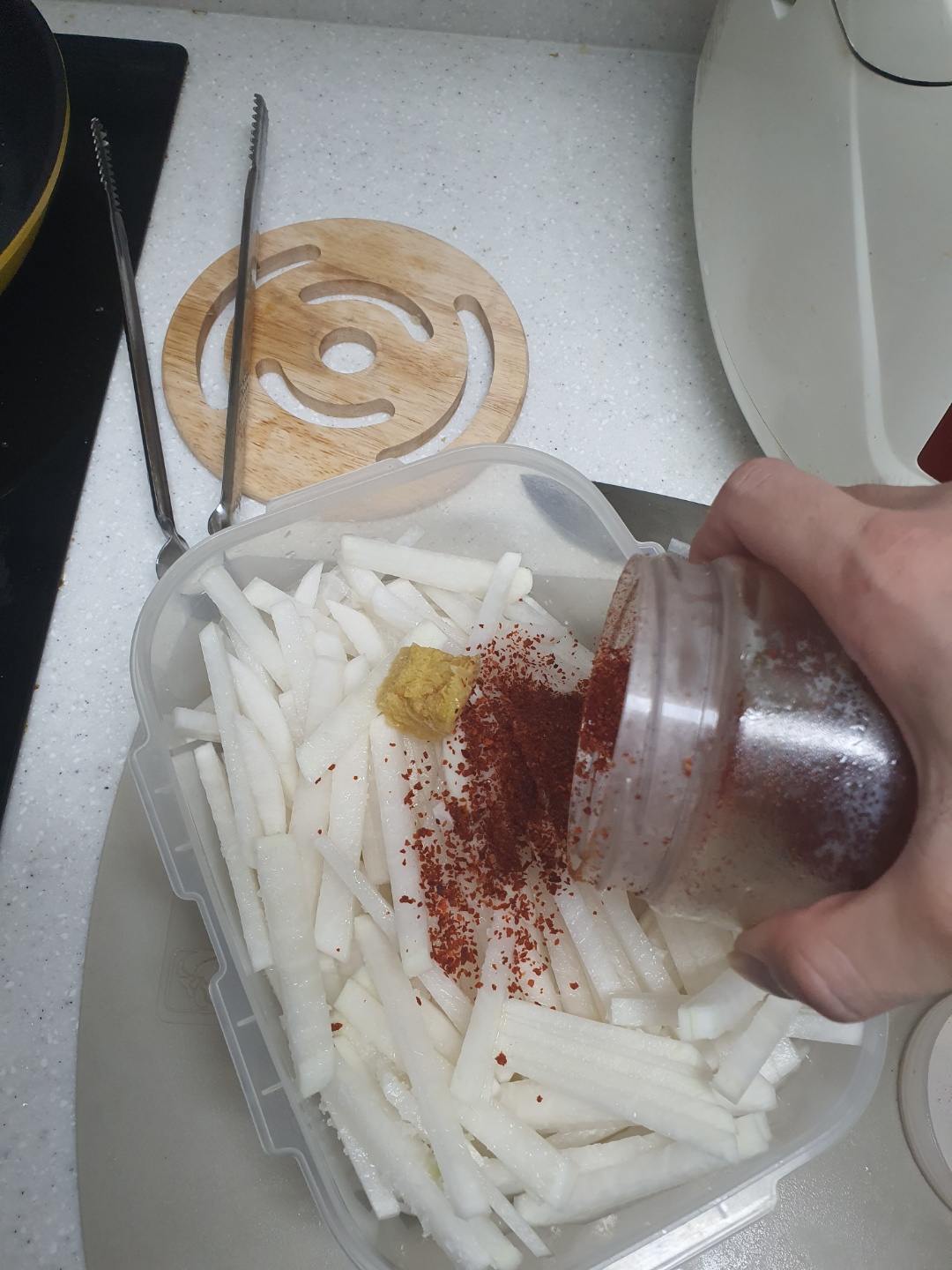 버무린 후 무에서 물이 나올 것이다. 20분 정도 후에 간을 본후 소금이나 설탕을 더첨가 하면 된다.