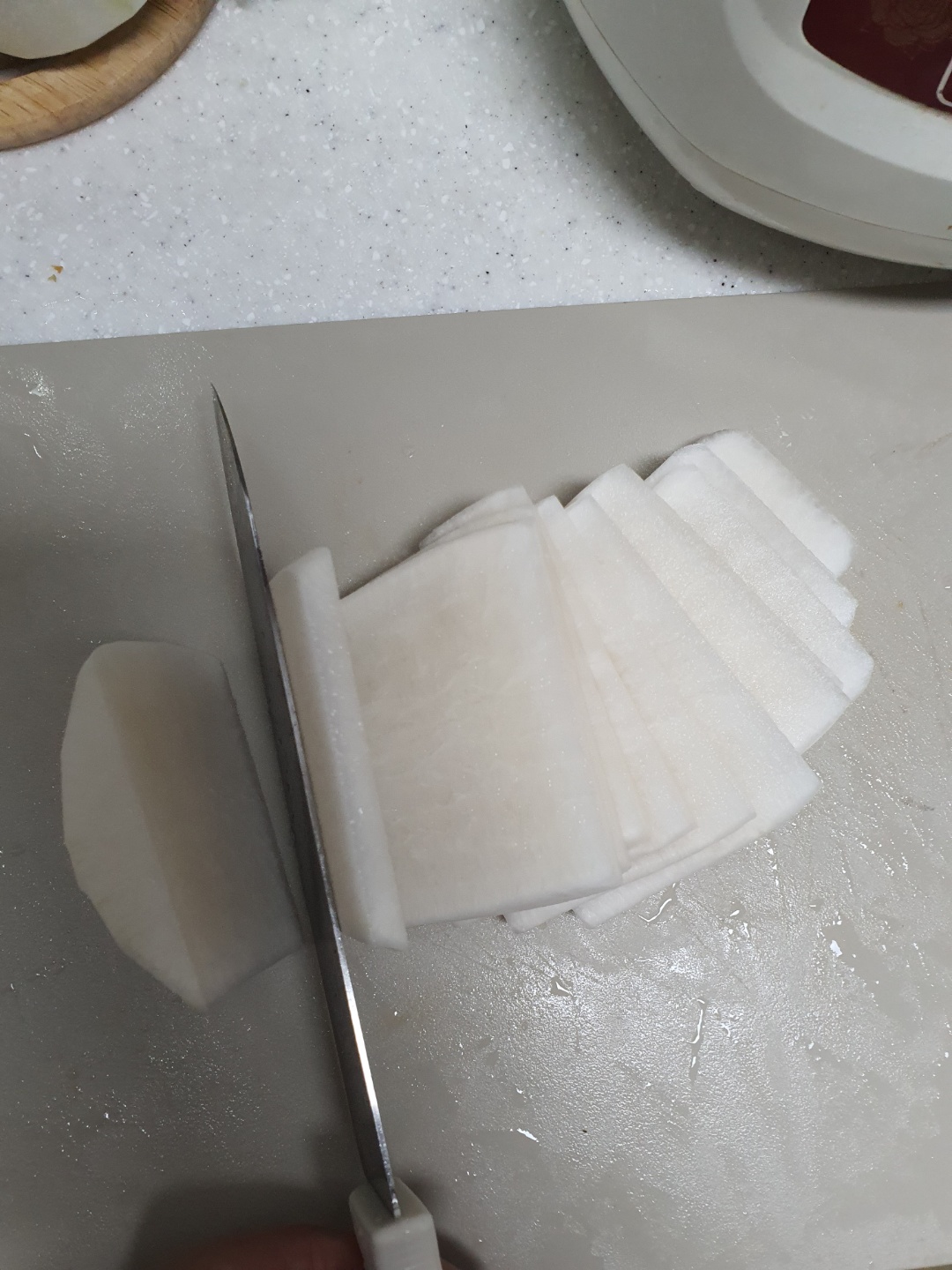 2. 무를 토막내서 썰자, 보통 내가 먹는 무생채 길이 만큼 자르면 된다. 보통 장단지 만한 무를 3~4등분 내는 것이 맞다.