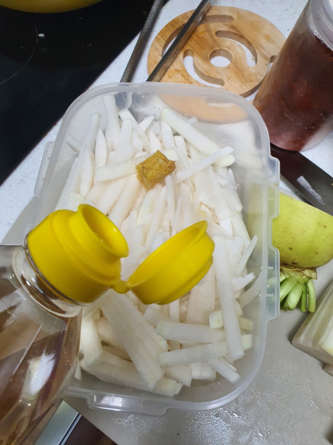 채썰기를 쭉 해서 그릇에 담아도 되지만 그냥 우리는 설거지를 더 하지 않기 위해서 무생채를 담을 반찬통에 넣는다.
