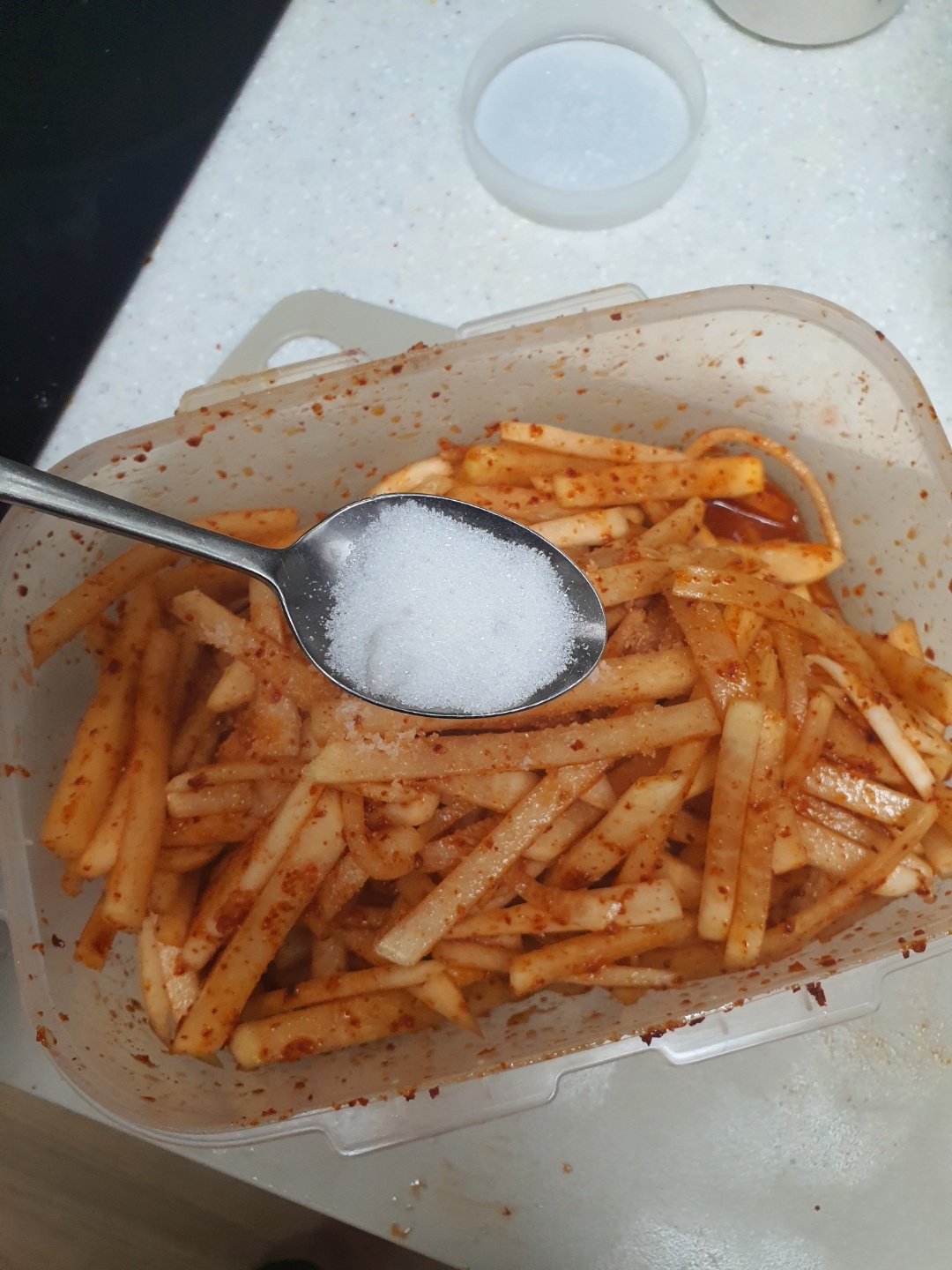 식초는 무 한주먹에 밥숫가락 반 스푼 정도로 생각하면 된다. 3주먹정도 되니 1.5스푼 정도 넣었다.