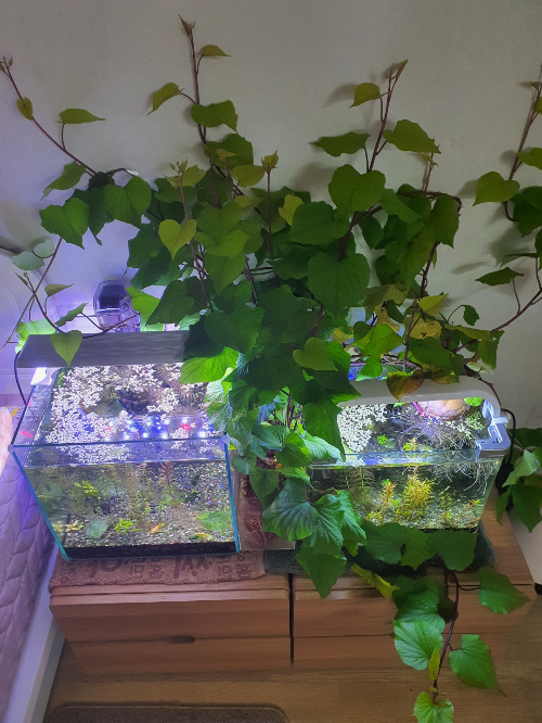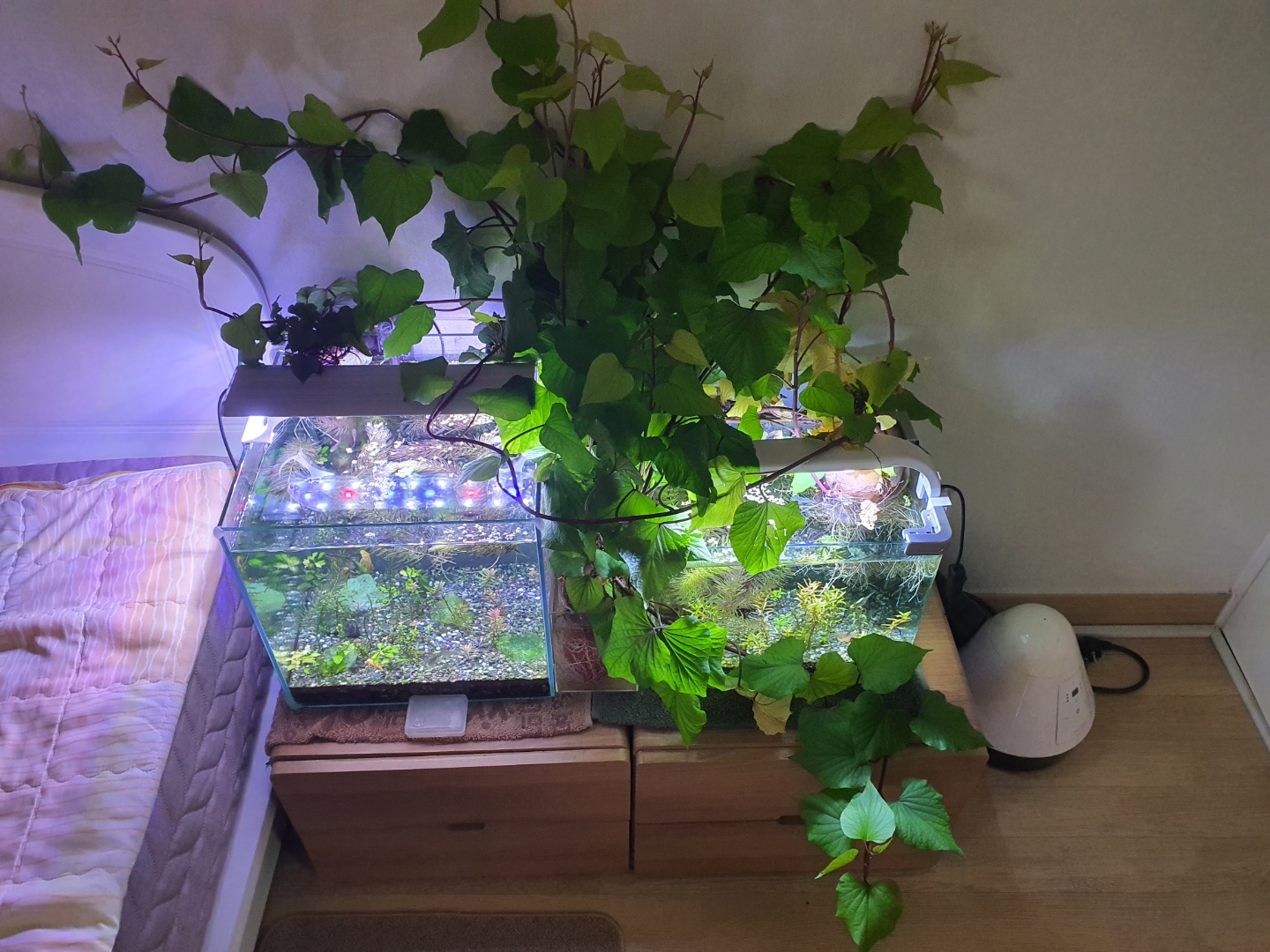 기존에는 여과기를 걸이식 여과기만 사용했었습니다. 물론 효과는 미미하고, 사실상 저는 수초로 균형을 유지하는 것을 좋아합니다. 또한 자취방에서도 푸른 식물을 많이 키우고 싶어서 고구마를 선택했습니다. 현재 한개 어항에만 고구마 여과기를 설치된 모습입니다. 중간에 어항 사이에 인테리어를 위해 고구마를 하나 더 키우고 있습니다. 어항 하나로 집의 분위기가 확 달라지는 것은 확연하게 느끼는 점인 것 같고 친구들이 와도 같은 말을 합니다. 무드등으로 거의 항시 조명을 키고 있어서 불을 끄고 살지만 그 효과는 확실한거 같습니다. 침대 옆에서 걸이식 여과기(여과효과 없음) 물의 순환과 물소리가 생겨서 밤에 잠을 잘때 ASMR로 들으면 금방 잠드는 것 같습니다.