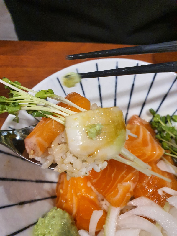 연어 + 와사비 + 소스 + 양파 + 무순을 모두 올려서 진심으로 먹어보면