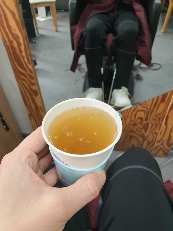 파마하고 기다리는 동안 유자차 한잔 주셔서 마셨습니다. 파마는 약 1시간에서 1시간 반 정도 걸리는 것 같습니다.
