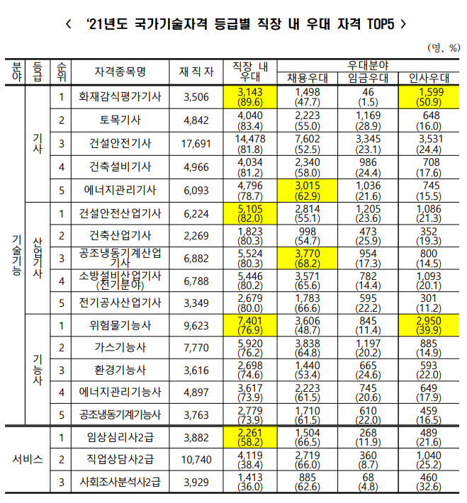 기술기능분야에서 직장 내 우대 비율이 높은 자격증으로는 기사 등급으로는 1위가 화재감식평가기사. 2위로는 토목기사, 3위로는 건설안전기사, 4위로는 건출설비기사. 5위로는 에너지관리기사 순으로 나타났습니다.