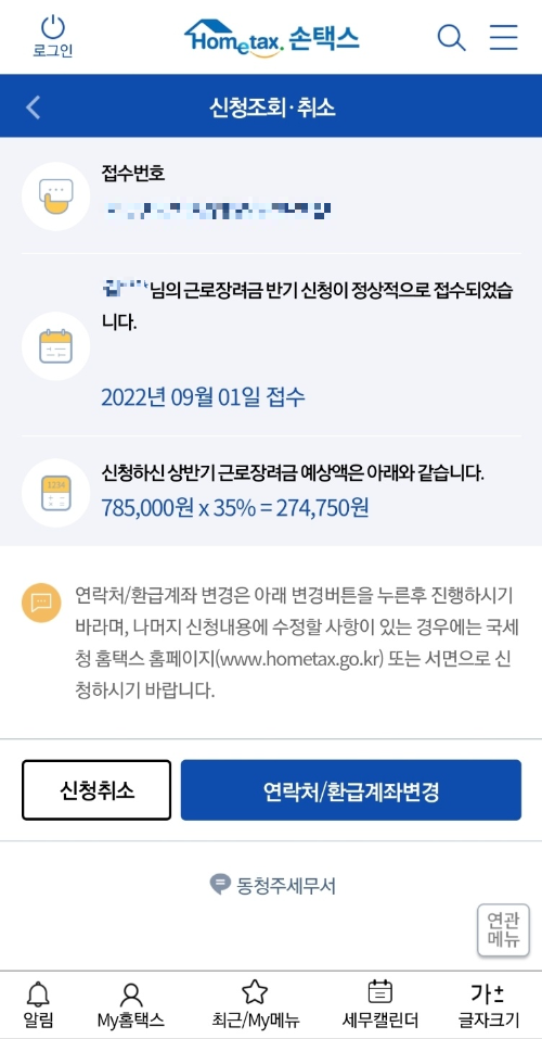 손택스로 연결이 되어 근로장려금은 신청하는 페이지로 자동으로 넘어갑니다.