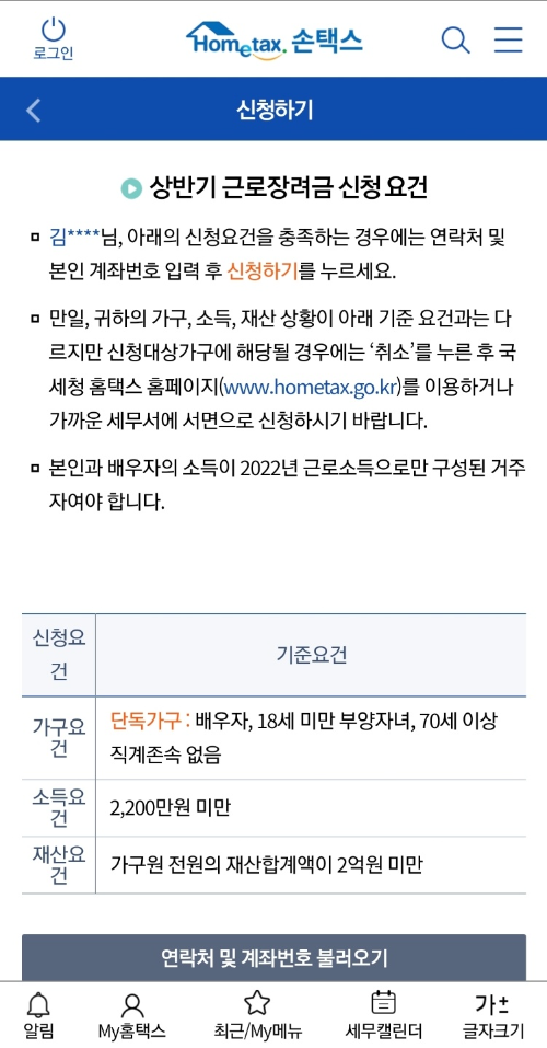9월 1일부터 15일 사이에 카톡으로 국세청에서 근로장려금을 신청하라고 이렇게 카톡이 옵니다.
